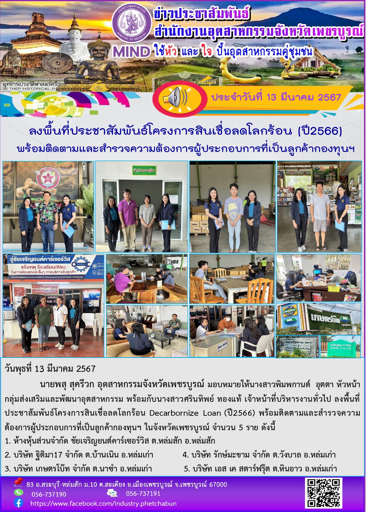 นายพสุ สุครีวก อุตสาหกรรมจังหวัดเพชรบูรณ์ มอบหมายให้นางสาวพิมพกานต์ อุตตา หัวหน้ากลุ่มส่งเสริมและพัฒนาอุตสาหกรรม พร้อมด้วยนางสาวศรินทิพย์ ทองแท้ เจ้าหน้าที่บริหารงานทั่วไป ลงพื้นที่ประชาสัมพันธ์โครงการสินเชื่อลดโลกร้อน Decarbornize Loan (ปี 2566) พร้อมติดตามและสำรวจความต้องการผู้ประกอบการที่เป็นลูกค้ากองทุนฯ ในจังหวัดเพชรบูรณ์ จำนวน 5 ราย ดังนี้