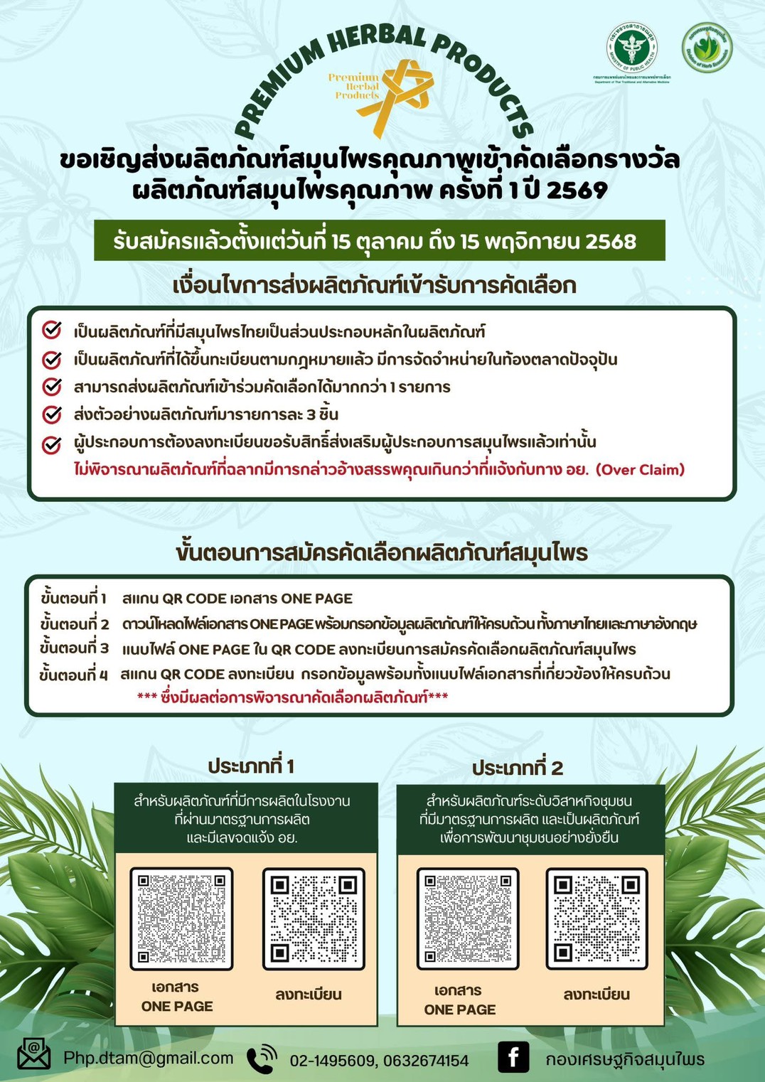 เชิญชวนผู้ประกอบการ ส่งผลิตภัณฑ์สมุนไพรคุณภาพเข้าคัดเลือกรางวัลผลิตภัณฑ์สมุนไพรคุณภาพ ครั้งที่ 1 ปี 2569 (Premium Herbal Products 2026 )