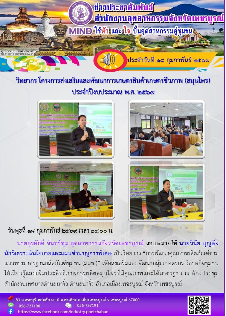 ร่วมเป็นวิทยากร โครงการส่งเสริมและพัฒนาการเกษตรสินค้าเกษตรชีวภาพ (สมุนไพร) ประจำปีงบประมาณ พ.ศ. 2569